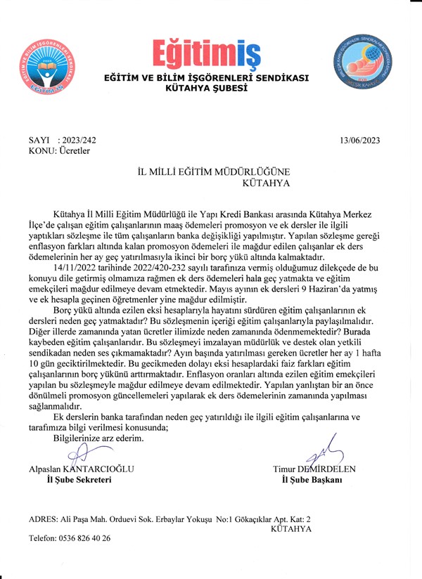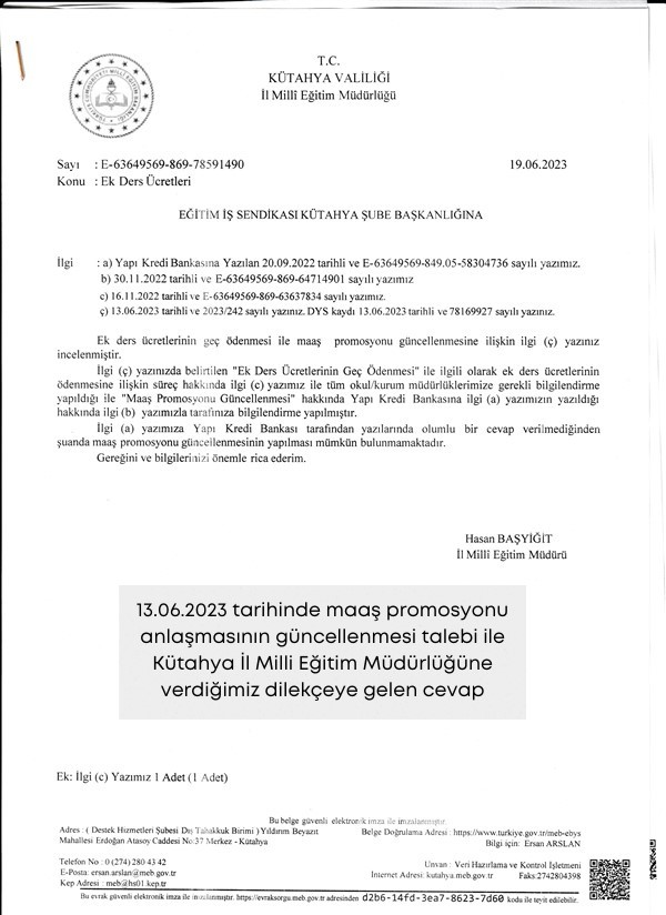 Kütahya İl Milli Eğitim Müdürlüğü ile Yapı Kredi Bankası arasında Kütahya Merkez İlçe’de çalışan eğitim çalışanlarının maaş ödemeleri promosyon ve ek dersler ile ilgili yaptıkları sözleşme ile tüm çalışanların banka değişikliği yapılmıştır. Yapılan sözleşme gereği enflasyon farkları altında kalan promosyon ödemeleri ile mağdur edilen çalışanlar ek ders ödemelerinin her ay geç yatırılmasıyla ikinci bir borç yükü altında kalmaktadır.