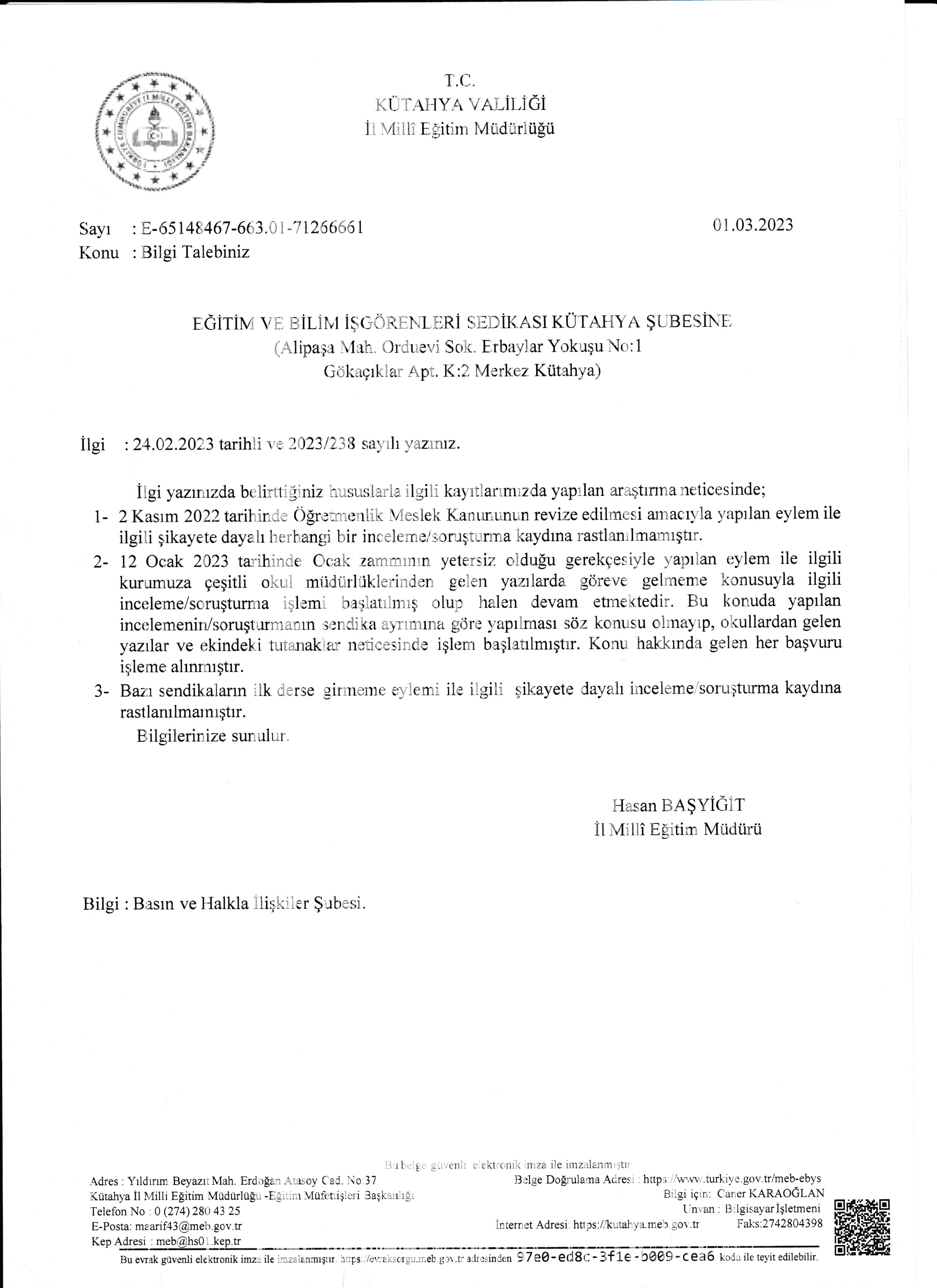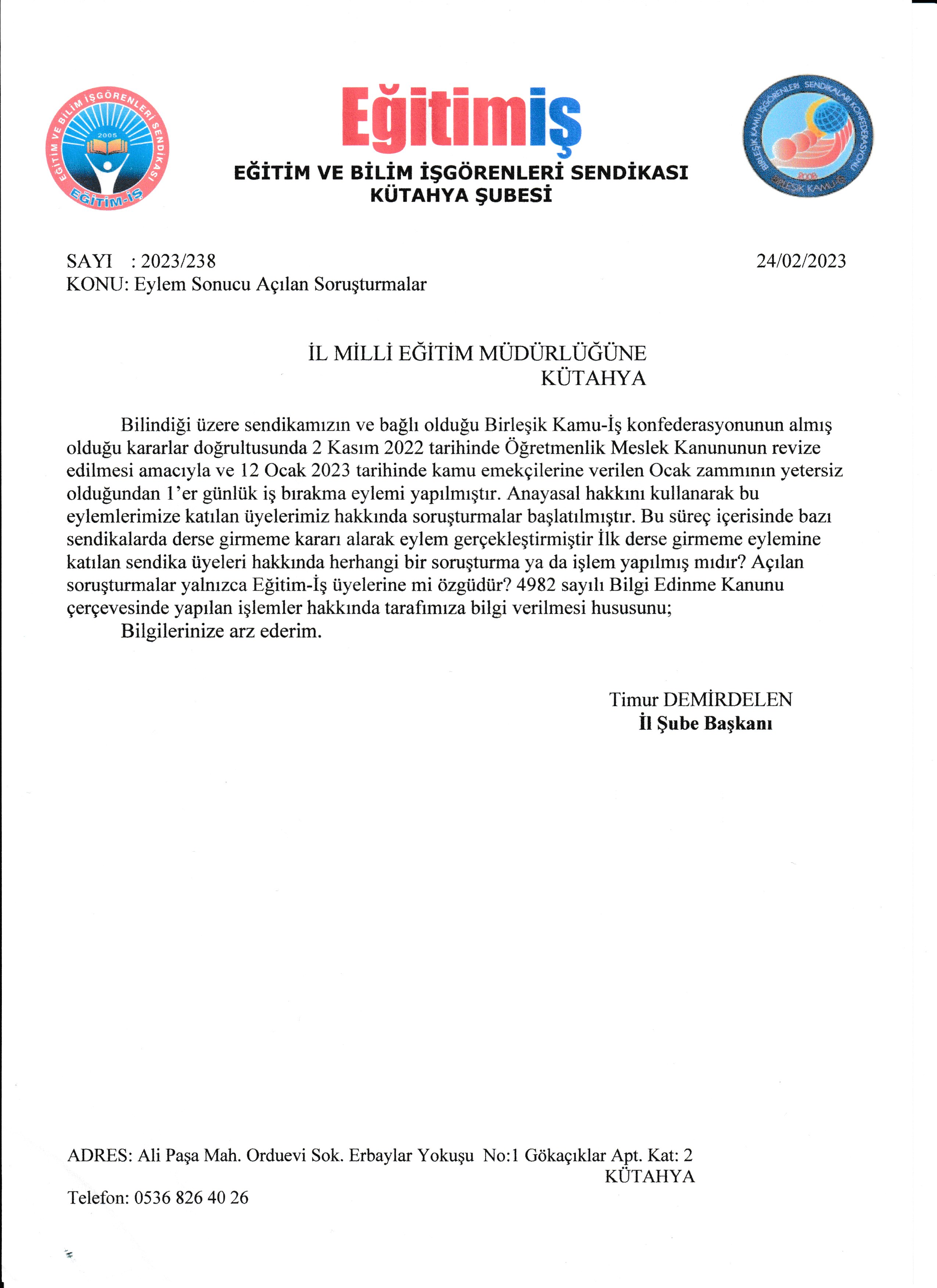 Bilindiği üzere sendikamızın ve bağlı olduğu Birleşik Kamu-İş konfederasyonunun almış olduğu kararlar doğrultusunda 2 Kasım 2022 tarihinde Öğretmenlik Meslek Kanununun revize edilmesi amacıyla ve 12 Ocak 2023 tarihinde kamu emekçilerine verilen Ocak zammının yetersiz olduğundan 1’er günlük iş bırakma eylemi yapılmıştır. Anayasal hakkını kullanarak bu eylemlerimize katılan üyelerimiz hakkında soruşturmalar başlatılmıştır. Bu süreç içerisinde bazı sendikalarda derse girmeme kararı alarak eylem gerçekleştirmiştir İlk derse girmeme eylemine katılan sendika üyeleri hakkında herhangi bir soruşturma ya da işlem yapılmış mıdır? Açılan soruşturmalar yalnızca Eğitim-İş üyelerine mi özgüdür? 4982 sayılı Bilgi Edinme Kanunu çerçevesinde yapılan işlemler hakkında tarafımıza bilgi verilmesi hususunu;