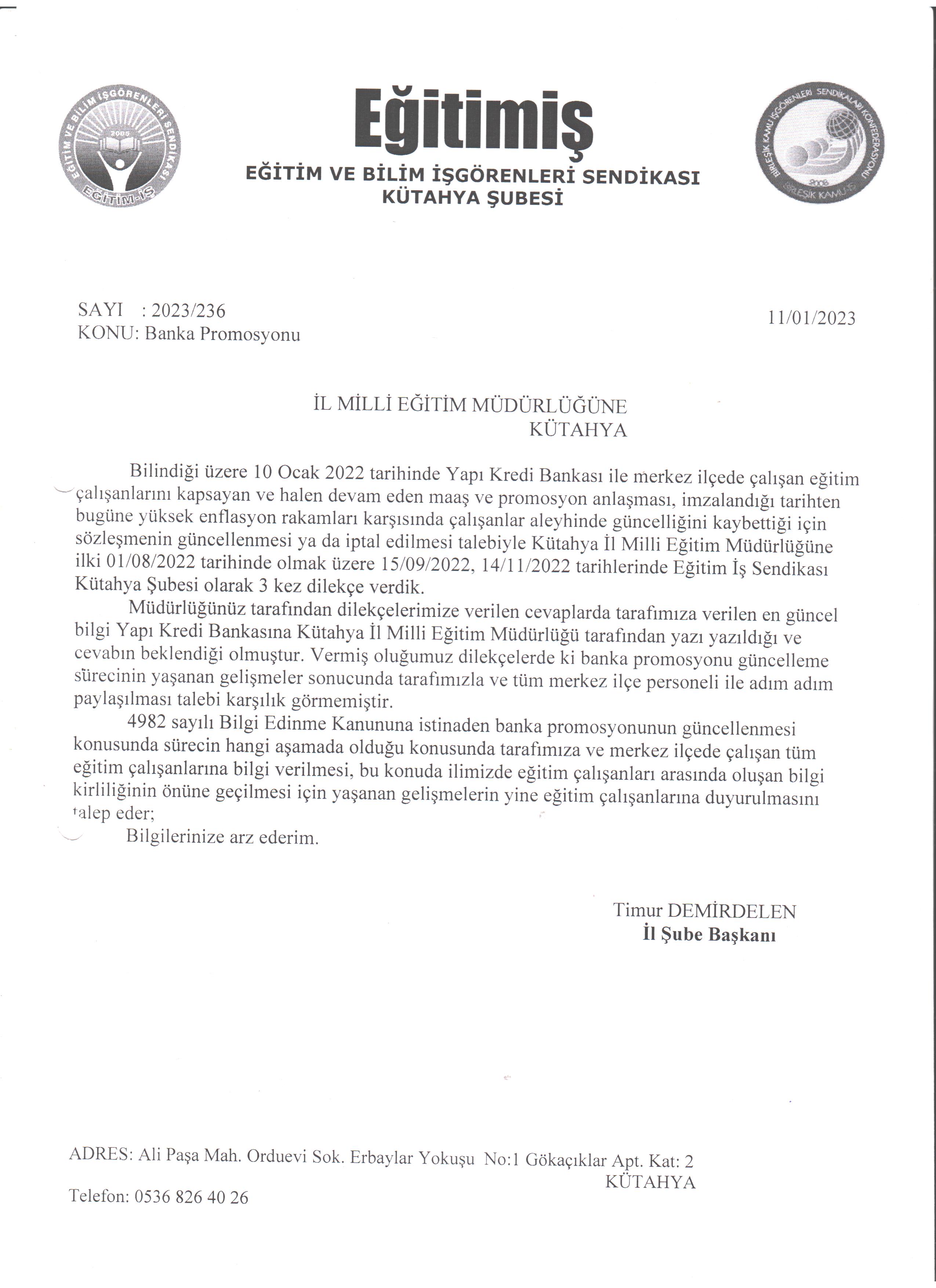 Banka maaş promosyonu anlaşmasının güncellenmesi için Ağustos ayında ilimizde bu konuyu ilk gündeme getiren Eğitim-İş Kütahya Şubesi olarak 11 Ocak 2023 tarihinde Kütahya İl Milli Eğitim Müdürlüğüne 4.kez dilekçemizi verdik. 06/10/2022 tarihinde konuyla ilgili yapmış olduğumuz basın açıklamasında da belirttiğimiz üzere bu sürecin yakın takipçisi olmaya devam edeceğiz. İlk dilekçemizin üzerinden 4 aydan fazla bir süre geçmiş olmasına rağmen bu konuda neden bir adım atılmadığını, neden herhangi bir açıklama yapılmadığını merak ediyor ve cevabını bekliyoruz.