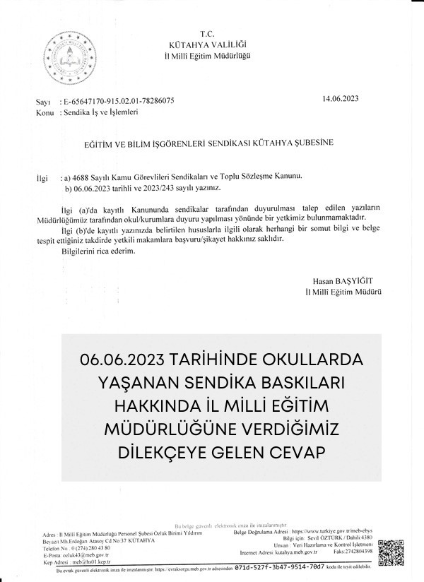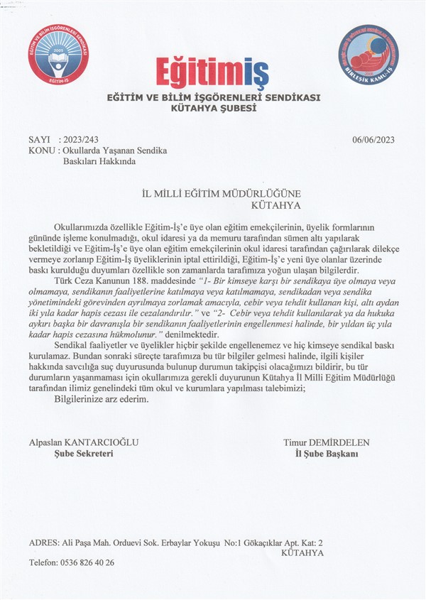 Sendikal faaliyetler ve üyelikler hiçbir şekilde engellenemez ve hiç kimseye sendikal baskı kurulamaz. Bundan sonraki süreçte tarafımıza bu tür bilgiler gelmesi halinde, ilgili kişiler hakkında savcılığa suç duyurusunda bulunup durumun takipçisi olacağımızı bildirir, bu tür durumların yaşanmaması için okullarımıza gerekli duyurunun Kütahya İl Milli Eğitim Müdürlüğü tarafından ilimiz genelindeki tüm okul ve kurumlara yapılması talebimizi;