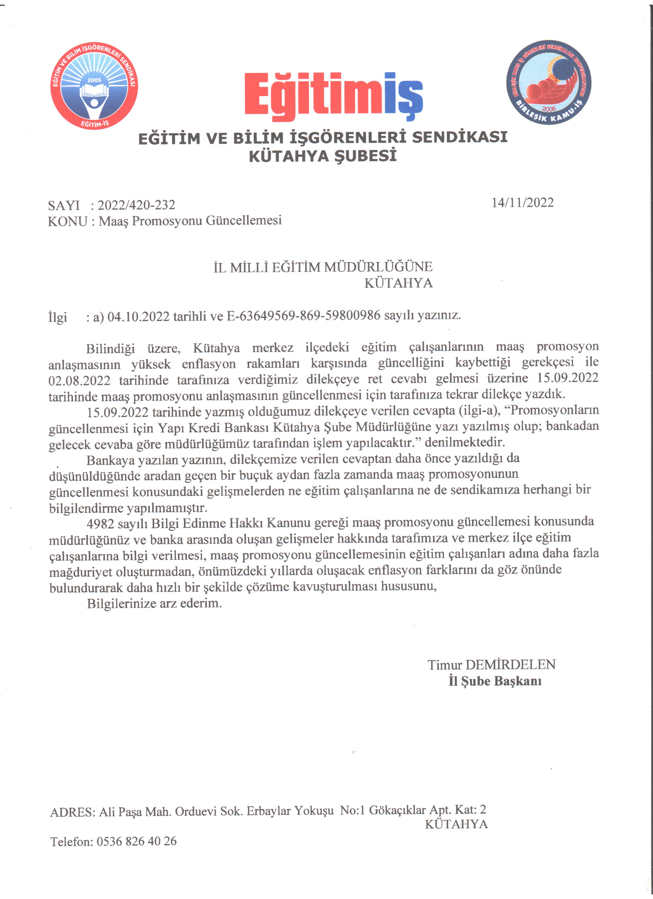 Bilindiği üzere, Kütahya merkez ilçedeki eğitim çalışanlarının maaş promosyon